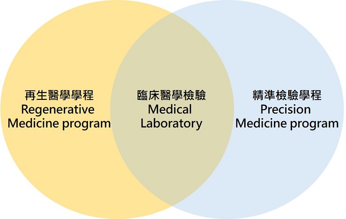 本系在專業特色除了臨床醫檢師的養成外更導入精準醫學與再生醫學學程,目的是培養更多生醫領域的專業人才緊密與生醫產業無縫接軌。為此,本系實行雙軌制學程,讓學生在既有醫事檢驗醫學背景下拓展再生醫學與精準醫學發展。四年制課程除了涵蓋「醫事檢驗師專門技術高等考試」必要的課程與學分(含800小時臨床實習)外,我們將大一課程設計得更加多元化,讓學生開始接觸精準醫學與再生醫學等探索課程,強化學生對於未來的分組選擇提供導引方向。
